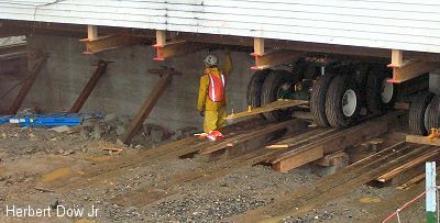 This is a view looking under the Odd Fellows Hall from the east side. The building now rest on about 6 of these sets of wheels. Each dolly has a built-in, 100 ton hydraulic jack. When the building is pulled out of position, the wheels will ride on i-beam tracks set in place on blocks and in the soil at the side of the building. |