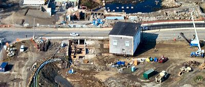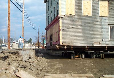 The photo below shows the OFH part-way down the street. There was a long, mid-afternoon pause in the progress because some of the wheels turned away from the desired track. However, after straightening them out, the building continued to move along.