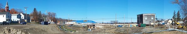 This panorama was made from pictures taken on October 22. From this view, the Odd Fellows Hall used to be in front of the blue tarp. You can see the old foundation and the opening under the street.
