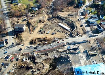 Click on this picture to view a larger copy. This aerial, taken Wednesday, shows lots of activity on the site. Just to the right of center, the box culverts are going into the old river channel. Digging for the bridge abutments has started on the North side of Main Street. On the left we can see the Odd Fellows Hall waiting to make the last leg of it's journey to the new location just down the Stetson Road. My mother took this picture. She and Dad are becoming accomplished photographers for The Cattail Press. Nice job, Betty! |