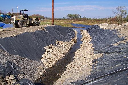 This is the lower end of the Mill Stream, a diversion ditch that now carries the water from the restored riverbed to the black pipe (just visible in the lower left) that runs under the new bridge. When completed the new river bed will be some distance to the west of this temporary channel. |
