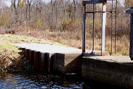 The Corundel Lake Dam, commonly known as the Upper Dam, has been repaired. There was a leak around the earth-dike end. Metal sheet piling was driven in on the upper side at the east end and new concrete was poured. |