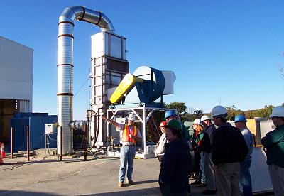 Yesterday, Rick Leighton of the EPA lead members of the SCCE and others on a walking tour of the Eastland Woolen Mill cleanup site in Corinna. The object in the background is a cooling tower used to cool the heated air removed from the soil decontamination beds. The soil is cleaned in batches of about 400 tons each. The latest batches have been successfully cleaned to the meet the EPA standards. The cleaned soil can be safely reused. The decontamination process will continue for sometime before a winter shut-down. It will resume again in the early spring. |