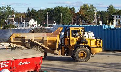 This truck carries a load of cleaned soil, just removed from the decontamination bed. The soil comes out of the bed at about 110 degrees F. Notice the steam. After cooling, samples will be tested to assure that the chlorobenzene has been removed to below the cleanup level. Then it will be spread as fill in Area 1. |