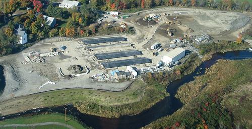 This aerial gives a good view of the recent earth work along the west side of the river, above the Route 7 bridge. It is that smooth stripe with shrubs planted running along the stream. |