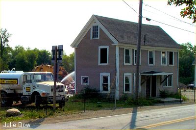 When work stopped yesterday, this is how the Sawtelle house looks now. The back section of the house is gone. Only the front remains. As you can see this is a family affair, Julie was on hand to make this picture. |