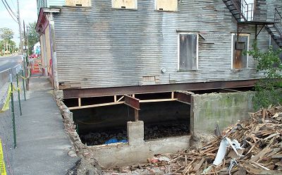 Preparations are underway for moving the Odd Fellows Hall. Here you can see an opening in the west side foundation. The area inside the hole is the old riverbed. Notice the I-beam structure supporting the building over the river. The rubble on the right is what remains of the Hoyt building. |