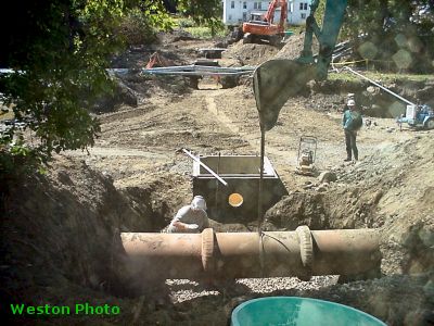 Less glamorous, I suppose than the excavation of contaminated soil, but still pretty important, this Weston picture dated 9/7/00, shows the existing town sewer line as it has been exposed so the new line can connect in. The most recent information I have schedules the utility work on the Newport Road for next week. They anticipate that the road will be closed during the day for most of the time from 9/18 to 9/27. The one-way traffic on Ireland Avenue and Maple Street will continue until 9/29. Of course, unanticipated complications can throw off any schedule. |