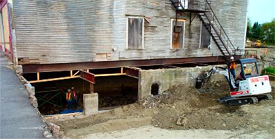 Preparations continue for moving the Odd Fellows Hall. Notice the workers underneath the building standing on the old river bed. The move is tentatively scheduled for the week of 9/25 to 9/29. |