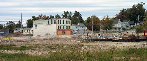 This view is from the northeast corner of the site looking back toward Main Street from where the grist mill used to be. The blue building to the right, behind the Odd Fellows Hall is the old Legion Hall. In an article in Friday's Bangor Daily News, reporter Brenda Seekings tells us that the move of the OFH is now slated for sometime between October 6th and 11th. |