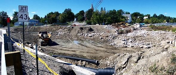 This small panorama looking west shows the hole where Main Street used to be. It was taken from near the new bridge a few days ago.