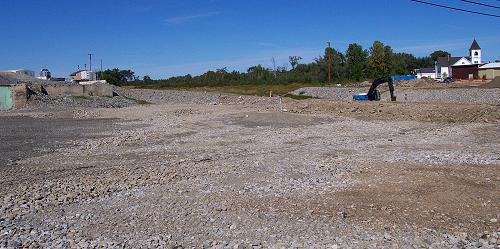 For this picture I put the camera lens through the chain link fence beside the new section of road connecting Route 43 to Route 7. The Eastland Woolen Mill used to occupy this ground. Remnants of the mill foundation can still be seen in the background on the left. A year ago there was a hole here 39 feet deep. It doesn't look like much now but in time this will be graded, usable land, suitable for development. |