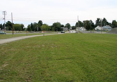 Looking south across the former mill location toward Route 7, this picture shows some of the land in the Corinna village area now cleared and restored from the mill demolition and cleanup. The pathway on the left is the recreational trail made from the former railroad bed. This land sits at a major crossroads for the automobile traffic on routes 7, 11, 43 and 222 and the recreational vehicle trail use by snowmobiles in the winter and four-wheelers the rest of the year. |