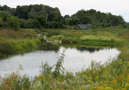 Just behind the area shown in yesterday's picture you will find this view, looking upstream. The Corundel Dam is in the distance with the ponded section of the river in the foreground. This is a major waterfowl habitat, especially in the winter. |