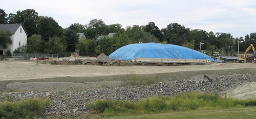 More land restoration is taking place. This area around the southern end of the mill floor slab along the bank of the river has been cleared, filled and graded. It's looking better all the time. |
