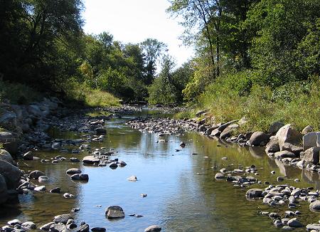We've seen many pictures of the view looking upstream from the village area. Here's a photo showing the view looking downstream from below the recreational trail bridge. The riverbed looks quite natural as it was restored after the excavation of contaminated soil. This view is just a few hundred feet from Route 7 through town. |
