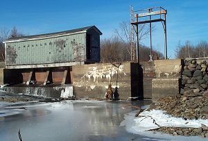 If you are familiar with the Upper Dam you may recognize this photo. It was taken December 28 from the east side of the mill pond, just below the dam. The pond has been drained. This dam is above the mill on the East Branch of the Sebasticook River. Behind it is Corundel Lake, commonly called the bog. |