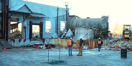 This picture, taken this afternoon, shows what is left of the pickerhouse in the parking lot just off Main Street. The way they were working on this, in a day or so there will be nothing left here. |