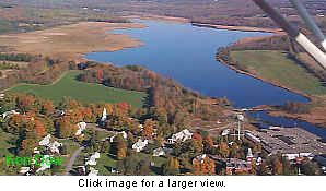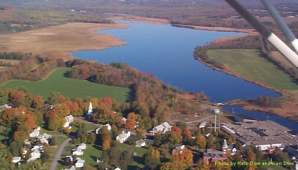 This is a photograph of the approved plan. It moves Route 7 to the south of the present Main Street passing south of the existing Odd Fellows Hall. The river is moved west so that it will run through what is now Henderson's Store. The orange blocks represent potential buildings in the future. I added the green text identifying some streets. |