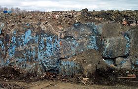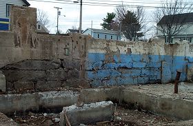 While walking in the open cellar during a recent visit to the Eastland demolition site, I noticed different sections in the foundation. This picture shows a part of the original foundation of the first mill built on Main Street in 1912. |