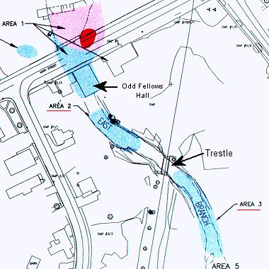 Area 1, also visible on this diagram, will be excavated next summer. This graphic is part of Figure 2 - Areas of soil contamination - Eastland Woolen Mill Site. It was handed out by the EPA at a public meeting. I added the labels for the Odd Fellows Hall, and the Trestle. I also underlined the labels for Area 2 and 3 in red. |