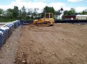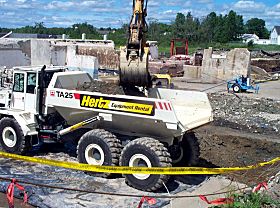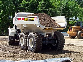 | Before the cleanup is over thousands of cubic yards of contaminated soil will be excavated. The trucks used to carry the soil have a solid dump body so no water can leak out during the trip from the excavation to the soil stockpile area. |