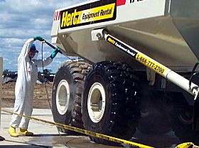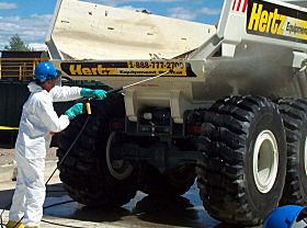 | After each load is dumped, the trucks are thoroughly cleaned at the decontamination pad before going out for the next trip. |