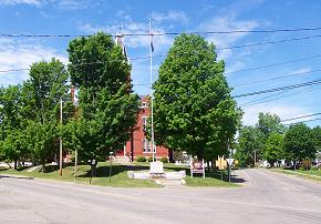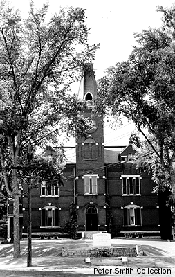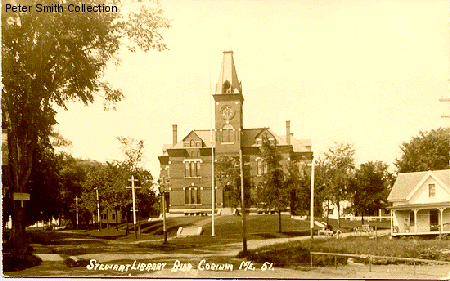 Here we see the building considerably later, after the monument was placed at the foot of the front walk. The elm trees grew and framed the building well. The nice thing about elm trees is they have tall trunks and a crown that is high above the ground. I feel sure that this is the way Levi Stewart wanted the building to look. I'm sure he chose elms because the leaves would not block the view of the building. I remember when these elms were removed, not that long ago. They were killed by Dutch Elm Disease. Maybe we can't replant elms but there are other trees that will grow the way the builder originally intended. |