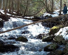store in 1907. So the photo was probably taken some time after that. Peter knows that his grandmother, Ethelyn Skinner Smith, came from Exeter and is related to the Pease and Barker families. They lived near the Chamberlain Cemetery, not far from the town line. Another clue, about 500 yards further along the Exeter Road from the falls you will find the East Barker Road. After Peter sent his picture I went back to the falls to see if I could re-create the view. Julie went with me but I couldn't get her to wear a hat and sit on a log like the woman in the post card photo. Take a look below. What do you think? Is it the same place, 90 years later?