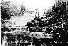 | Cobbie and Lilla Eaton own the property where the falls is located. Lilla tells me that she has known the stream as Meadow Brook. In our conversation I described Peter's post card. Lilla says that Barker Brook is a likely older name because a man named Barker once owned land up-stream of the falls. She says he was a poet and suggested that members of the Corinna Literary Club might know more about him. Do you suppose this is a picture of Mr. and Mrs. Barker? The F. B. Shaw named on the postcard is Flavil B. Shaw.