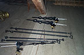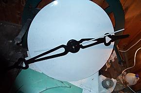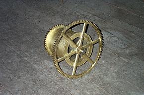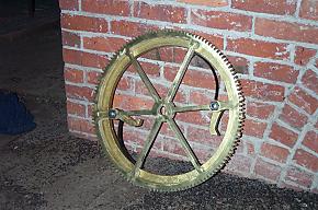 | Here we see the other clock hands and the shafts that run from the central mechanism to the hands on each face. Below are the drum that the winding cable winds up on and a gear that has been repaired. |