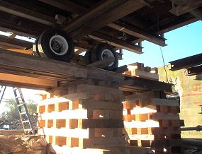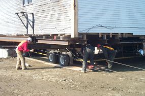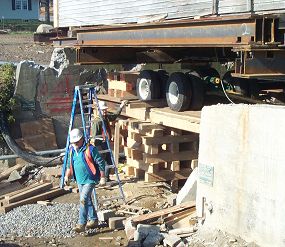 After weeks of preparation involving extensive blocking with new i-beams and wooden crib-work, the Odd Fellows Hall was ready to move on Saturday, October 21. Six sets of dolly wheels were placed under the building on tracks built below the structure and out to the side. |