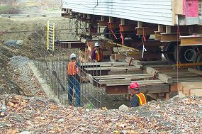 In a process somewhat like the reverse of moving it off the old foundation, the building was pulled into position over the new location. |